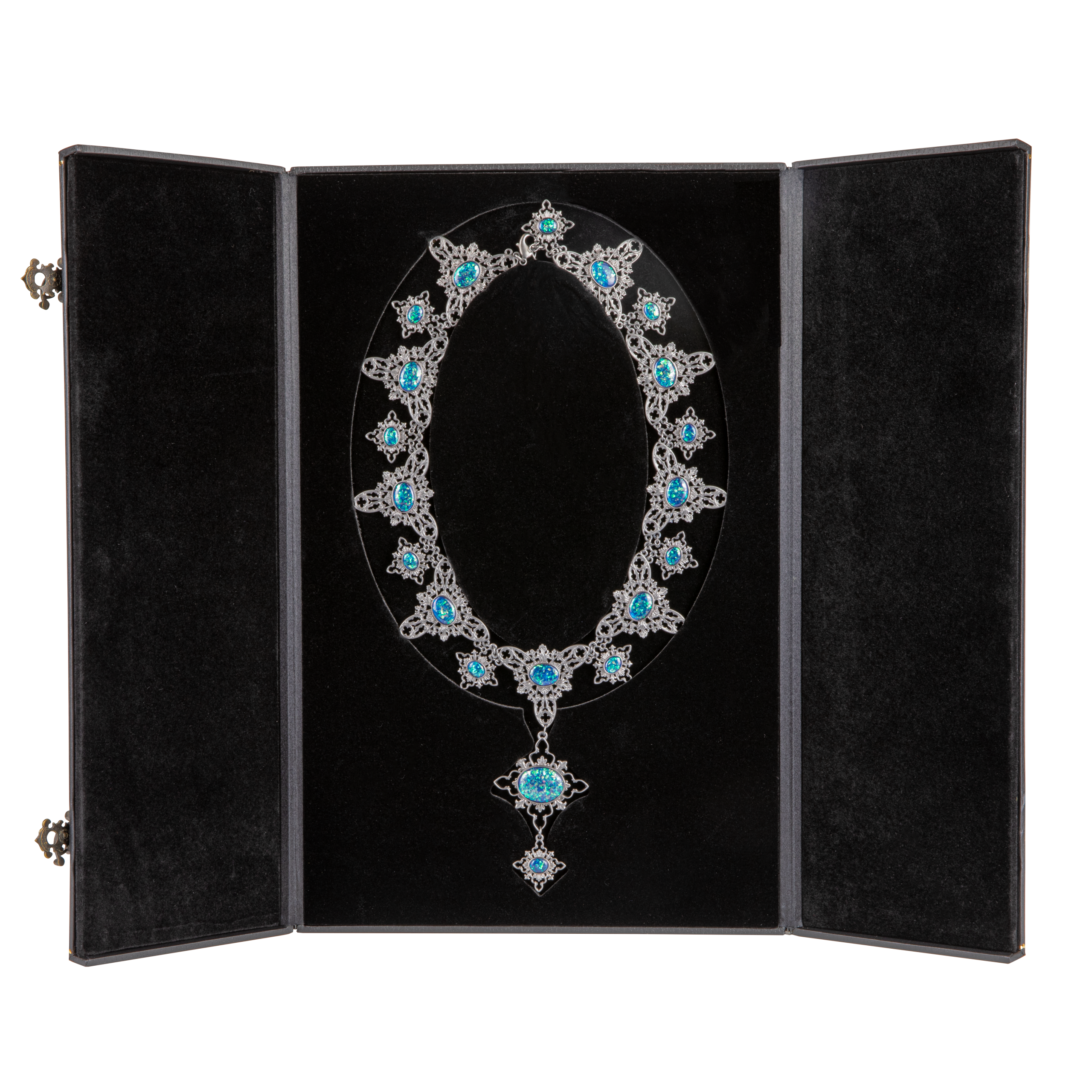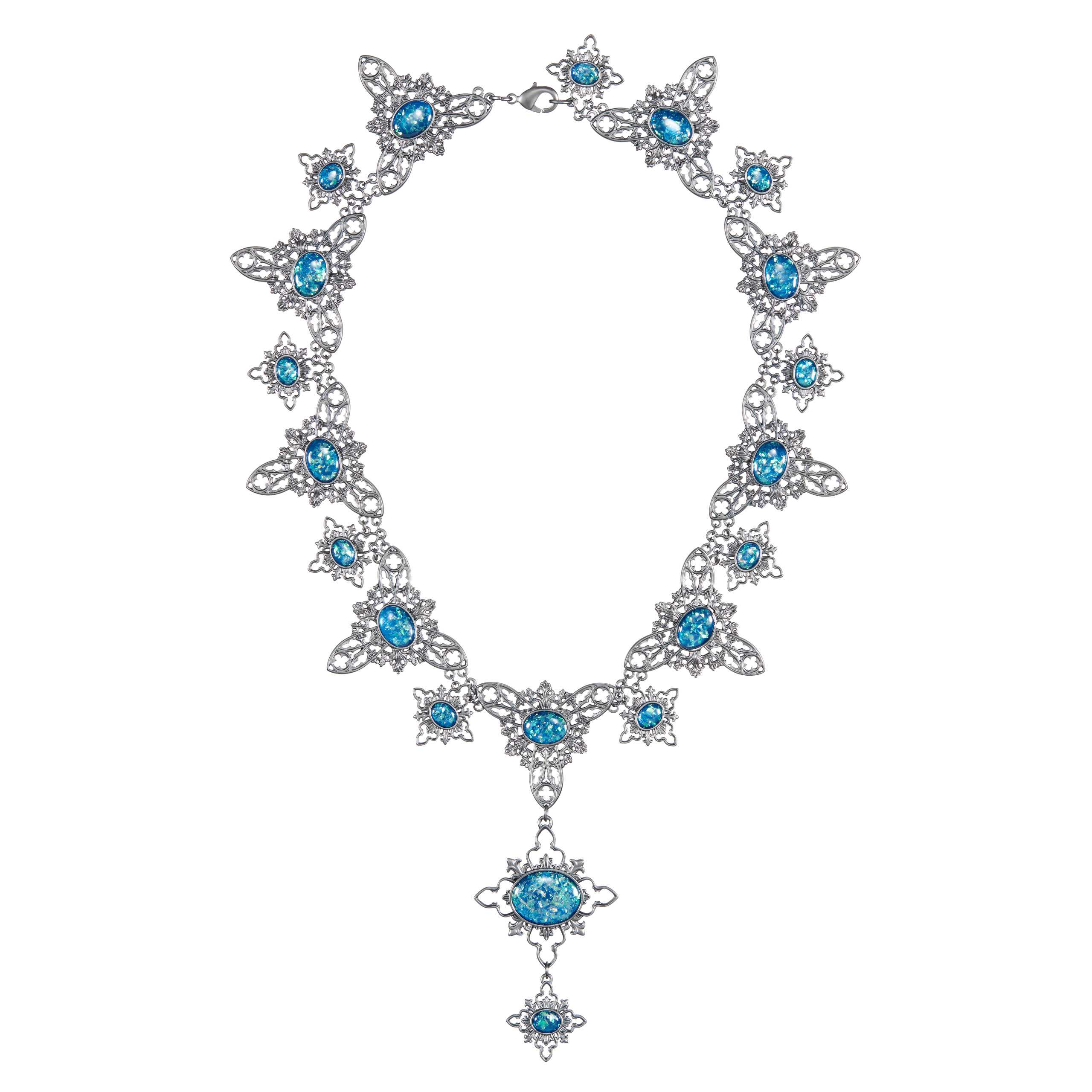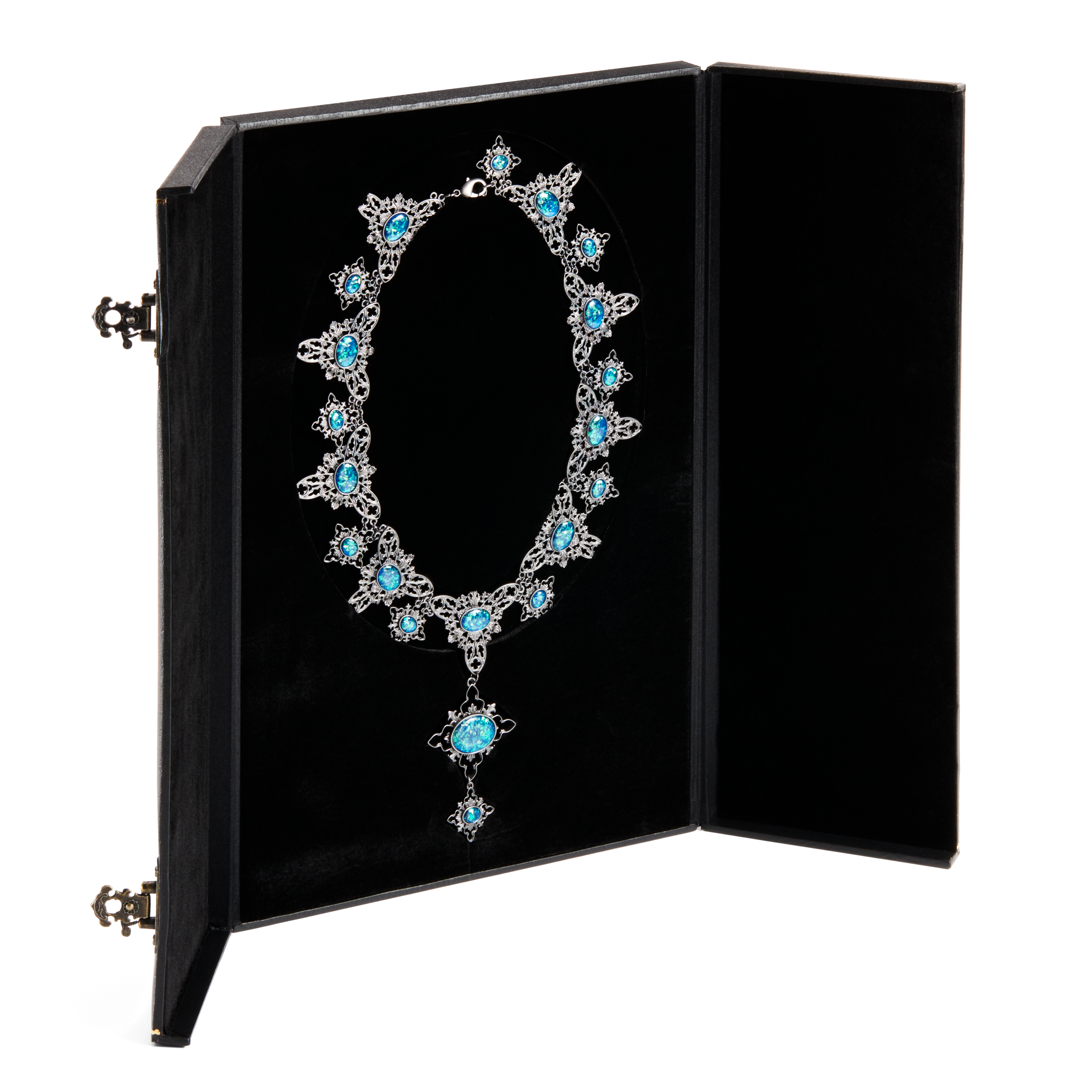 Mit ihren 20 irisierend blauen Steinen und den kunstvoll gearbeiteten, antik silberfarbenen Verzierungen ist sie ein Blickfang in jeder Sammlung. Bewahre sie sicher auf oder präsentiere sie eindrucksvoll in der ca. 33 cm hohen Sammlerbox aus Lederimitat mit Metallschwenkverschlüssen und weichem, schwarzem Velours-Innenfutter.