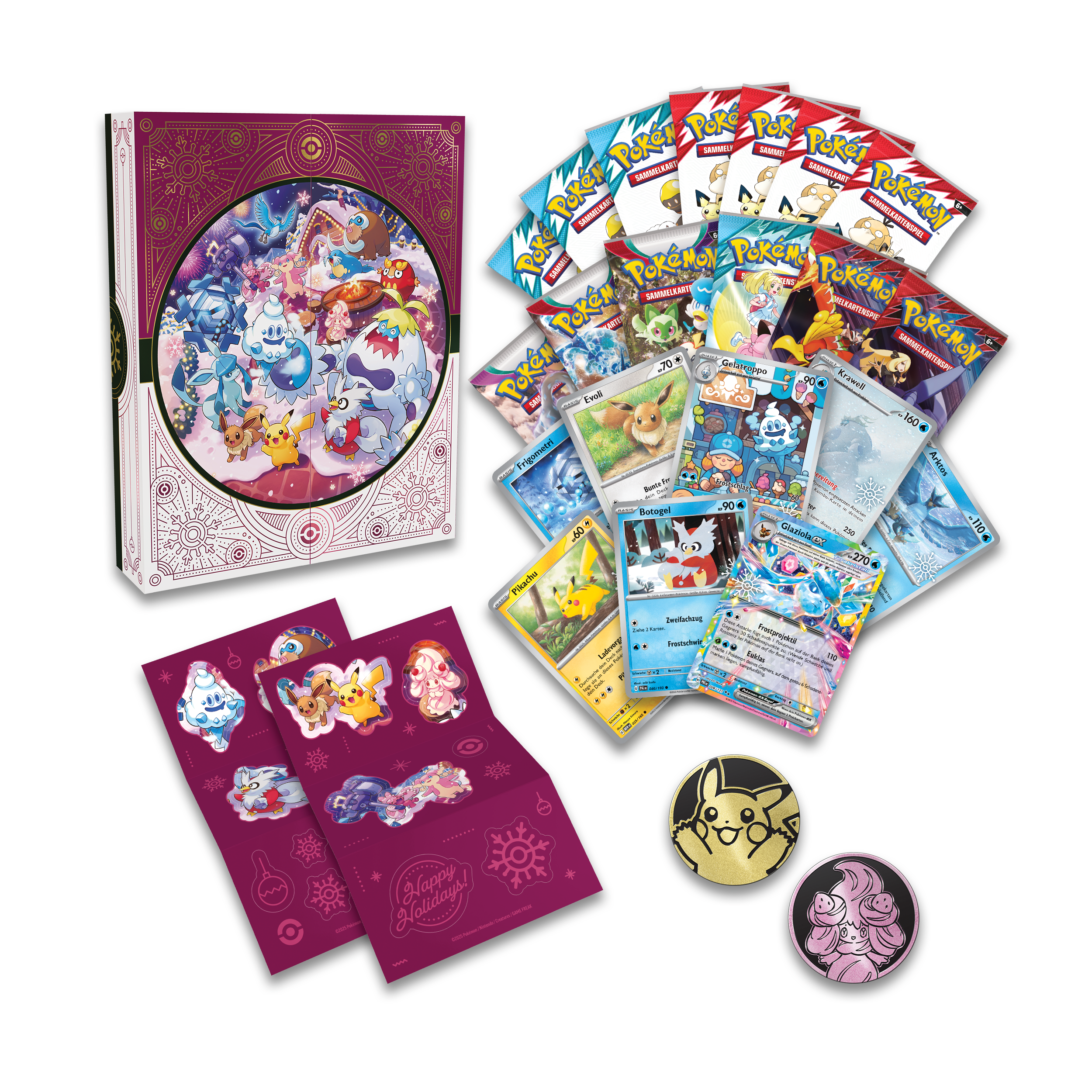 Feiere die fröhlichste aller Jahreszeiten mit 25 Tagen voller Überraschungen im Festtagskalender des Pokémon-Sammelkartenspiels! Von besonderen holografischen Karten bis zu Boosterpacks und mehr gibt es jeden Tag eine andere Pokémon-Gabe zu entdecken. Egal, ob du dir selbst etwas gönnst oder andere beschenkst, mit diesem Festtagskalender wird jeder Tag etwas ganz Besonderes.
